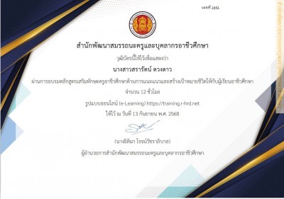 การอบรมหลักสูตรเสริมทักษะครูอาชีวศึกษาด้านหารแนะแนวและสร้างเป้าหมายชีวิตให้กับผู้เรียนอาชีวศึกษา จำนวน 12 ชั่วโมง เสริมทักษะครูอาชีวศึกษาด้านการแนะแนวและสร้างเป้าหมายชีวิตให้กับผู้เรียนอาชีวศึกษา 05/09/2568 - 30/09/2568 หลักสูตรทั่วไป (รูปแบบออนไลน์) - บทเรียนออนไลน์ ผ่านการอบรม
