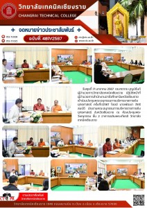 วันพฤหัสบดีที่ 25 มกราคม 2567 ดร.ศรากร บุญปถัมภ์ ผู้อำนวยการวิทยาลัยเทคนิคเชียงราย เป็นประธานการประชุมคณะกรรมการบริหารสถานศึกษา และหัวหน้าแผนกวิชาวิทยาลัยเทคนิคเชียงราย เพื่อพิจารณาการรับย้ายของข้าราชการครู ครั้งที่ 1/2567 ตลอดจนแจ้งเรื่องการยกเลิกการปฏิบัติหน้าที่ครูเวร ตามมติ ครม. และหนังสือด่วนที่สุด เรื่อง ขอซักซ้อมการยกเลิกการปฏิบัติหน้าที่เวรประจำวันของครู และบุคลากรทางการศึกษา ของสถานศึกษาในสังกัดสำนักงานคณะกรรมการการอาชีวศึกษา พร้อมกันพิจารณามาตรการรักษาความปลอดภัย ภายในสถานศึกษา ณ ห้องประชุมพระวิษณุกรรม ชั้น 2 อาคารเฉลิมพระเกียรติ วิทยาลัยเทคนิคเชียงราย