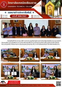 วันพฤหัสบดีที่ 25 มกราคม 2567 ดร.ศรากร บุญปถัมภ์ ผู้อำนวยการวิทยาลัยเทคนิคเชียงราย ลงนามบันทึกข้อตกลงให้ความร่วมมือ(MOU) ระหว่างวิทยาลัยเทคนิคเชียงราย ร่วมกับคุณอมรรัตน์ แซ่โค้ว ผู้บริหารบริษัท เซ็ลทรัลรีเทล คอร์ปอเรชั่น จำกัด(มหาชน) ณ ห้องประชุมพระวิษณุกรรม ชั้น 2 อาคารเฉลิมพระเกียรติ วิทยาลัยเทคนิคเชียงราย