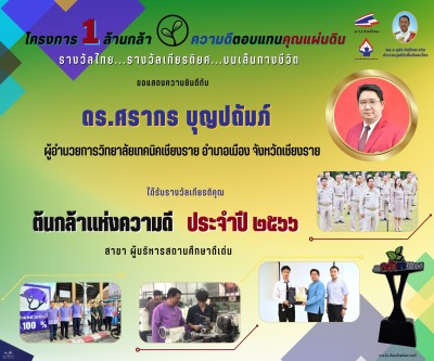 วันศุกร์ที่ 15 ธันวาคม 2566 ดร.ศรากร บุญปถัมภ์ ผู้อำนวยการวิทยาลัยเทคนิคเชียงราย เข้ารับรางวัลไทย รางวัลเกียรติยศ บนเส้นทางชีวิต โครงการ 1 ล้านกล้าต้นกล้าความดีตอบแทนคุณแผ่นดิน ประจำปี 2566 ณ หอประชุมกองทัพอากาศ กรุงเทพมหานคร