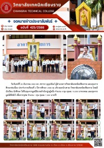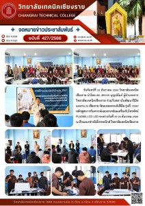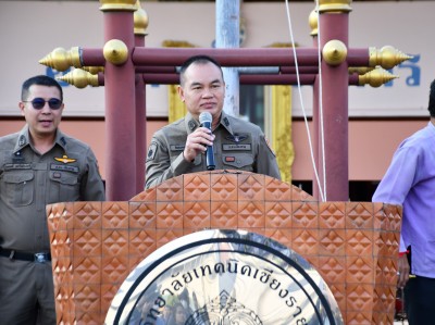 วันพฤหัสบดีที่ 21 ธันวาคม 2566 ดร.ศรากร บุญปถัมภ์ ผู้อำนวยการ วิทยาลัยเทคนิคเชียงราย ร่วมกับภาคีเครือข่ายจากสถานีตำรวจภูธรเมืองเชียงราย นำโดย พ.ต.ท.ฉันทฤทธิ์ เหล่าไพโรจน์จารี รอง ผกก.ป.สภ.เมืองเชียงราย และคณะเจ้าหน้าที่ตำรวจ ลงพื้นที่ ชี้แจงและให้แนวคิดแก่นักเรียน นักศึกษา ในกิจกรรมหน้าเสาธง ทั้งนี้เพื่อเป็นการป้องกัน และป้องปรามปัญหายาเสพติด บุหรี่, บุหรี่ไฟฟ้า, การดัดแปลงสภาพ รถจักรยานยนต์ รวมถึงพฤติกรรมที่ไม่เหมาะสมของนักเรียน นักศึกษาของวิทยาลัยเทคนิคเชียงราย ตามนโยบายสถานศึกษาปลอดภัย ของกระทรวงศึกษาธิการ และสำนักงานคณะกรรมการการอาชีวศึกษา ณ วิทยาลัยเทคนิคเชียงราย