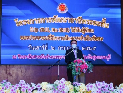 วันที่ 2 กรกฎาคม 2565 ดร.ศรากร บุญปถัมภ์ ผู้อำนวยการวิทยาลัยอาชีวศึกษาสุพรรณบุรี กล่าวรายงานพิธีเปิดโครงการ การพัฒนาอาชีพระยะสั้น (Up Skill, Re Skill) ให้กับนักเรียน และประชาชนที่มีความต้องการจำเป็นพิเศษ โดยนายมณฑล ภาคสุวรรณ์ รองเลขาธิการคณะกรรมการการอาชีวศึกษา ให้เกียรติเป็นประธานเปิดงาน ณ วิทยาลัยสารพัดช่างบรรหาร - แจ่มใส จังหวัดสุพรรณบุรี หลังจากเสร็จพิธี คณะผู้บริหาร และคณะครู บุคลากร วิทยาลัยอาชีวศึกษาสุพรรณบุรี ได้ต้อนรับ นายมณฑล ภาคสุวรรณ์ รองเลขาธิการคณะกรรมการการอาชีวศึกษา พร้อมคณะ ที่เข้าตรวจเยี่่ยมวิทยาลัยอาชีวศึกษาสุพรรณบุรี