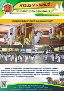 วันที่ 3 ธันวาคม 2564 วิทยาลัยอาชีวศึกษาสุพรรณบุรี โดย ดร.ศรากร บุญปถัมภ์ ผู้อำนวยการฯ เป็นประธานในพิธีถวายพานพุ่มดอกไม้และพิธีถวายบังคม พร้อมเครื่องราชสักการะ เพื่อน้อมรำลึกในพระมหากรุณาธิคุณ เนื่องในวันคล้ายวันพระราชสมภพ พระบาทสมเด็จพระบรมชนกาธิเบศร มหาภูมิพลอดุลยเดชมหาราช บรมนาถบพิตร วันชาติ และวันพ่อแห่งชาติ 5 ธันวาคม 2564 ณ โดมรวมน้ำใจ วิทยาลัยอาชีวศึกษาสุพรรณบุรี