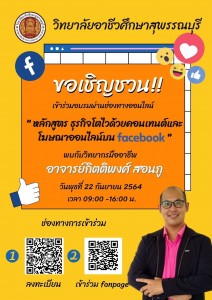 วันที่ 22 กันยายน 2564 วิทยาลัยอาชีวศึกษาสุพรรณบุรี จัดการอบรมผู้ประกอบการออนไลน์ หลักสูตรที่ 2 'ธุรกิจโตไวด้วยคอนเทนต์และโฆษณาออนไลน์บน FaceBook' โดยวิทยาลัยอาชีพ อาจารย์กิตติพงศ์ สอนภู