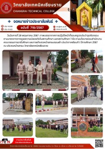 ภาพบรรยากาศการปฏิบัติหน้าที่ของครูเวรประจำจุดคัดกรอง ตามมาตรการการดูแลความปลอดภัยในสถานศึกษา นอกสถานศึกษา 7 ข้อ ตามนโยบายของสำนักงานคณะกรรมการอาชีวศึกษา และการเข้าแถวหน้าเสาธงตอนเช้า ประจำภาคเรียนที 1 ปีการศึกษา 2567 ณ บริเวณหน้าเสาธง วิทยาลัยเทคนิคเชียงราย