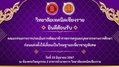วันจันทร์ที่ 10 มิถุนายน 2567 ดร.ศรากร บุญปถัมภ์ ผู้อำนวยการวิทยาลัยเทคนิคเชียงราย พร้อมด้วยรองผู้อำนวยการทั้ง 4 ฝ่าย ให้การต้อนรับ เรืออากาศโทสมพร ปานดำ รองเลขาธิการคณะกรรมการการอาชีวศึกษา และ ศาตราจารย์ ดร.ปรัชญานันท์ นิลสุข กรรมการประเมินผลการพัฒนาข้าราชการครูและบุคลากรทางการศึกษา ก่อนแต่งตั้งให้เลื่อนเป็นวิทยฐานะเชี่ยวชาญพิเศษ (คศ.5) ณ ห้องพระวิษณุกรรม 2 อาคารเฉลิมพระเกียรติ วิทยาลัยเทคนิคเชียงราย