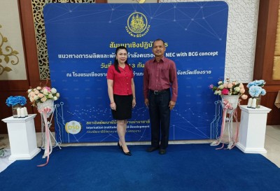นางกนิษฐา คลังแสง รองผู้อำนวยการวิทยาลัยเทคนิคเชียงรายพร้อมด้วยนายมนตรี ม่วงวงษ์ เข้าร่วมสัมนาเชิญปฏิบัติการเรื่อง แนวทางการผลิตและพัฒนากำลังคนรองรับ NEC With BCG Concept ระหว่างวันที่12-13 กันยายน 2566 ณ โรงแรมเชียงรายแกรนด์รูม อำเภอเมืองเชียงราย จังหวัดเชียงราย