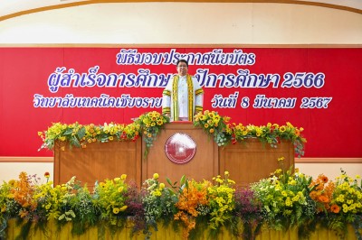 วันศุกร์ที่ 8 มีนาคม 2567 ดร.ศรากร บุญปถัมภ์ ผู้อำนวยการวิทยาลัยเทคนิคเชียงราย เป็นประธานกล่าวโอวาทในพิธีมอบใบประกาศนียบัตรผู้สำเร็จการศึกษา และเป็นประธานในพิธีมอบประกาศนียบัตร และให้โอวาทแก่นักเรียน นักศึกษา ระดับชั้น ปวช.และ ปวส ที่สำเร็จการศึกษา ประจำปีการศึกษา 2566 ณ ห้องประชุม แผนกวิชาช่างยนต์ ชั้น 4 วิทยาลัยเทคนิคเชียงราย